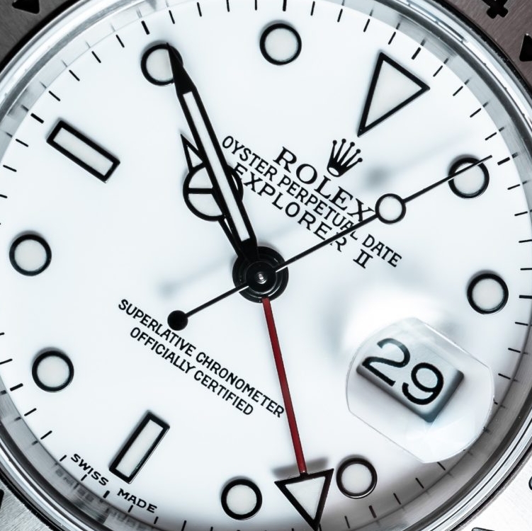 Fast-forward to 1989 when Rolex releases the Explorer II Ref. 16570, which had an impressive run of nearly 22 years before the 216570 was released in 2011. The 16570 iterated on the 16550 with the new caliber 3185 movement and a small but substantial change to the polar dial model. By replacing the silver outlined hands and indices with black, the legibility greatly improved by really accentuating the white dial. Also, the font used on the bezel numerals changed between the 16550 and 16570, which is just a matter of taste.